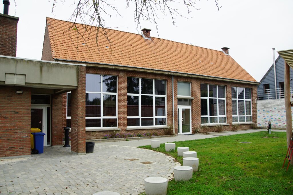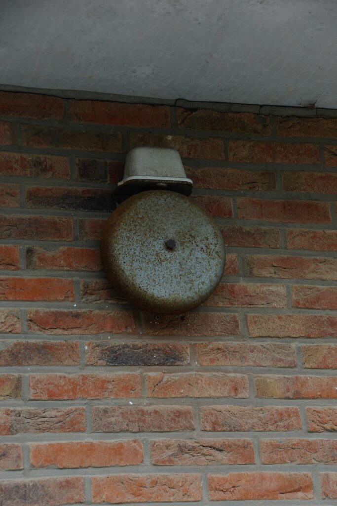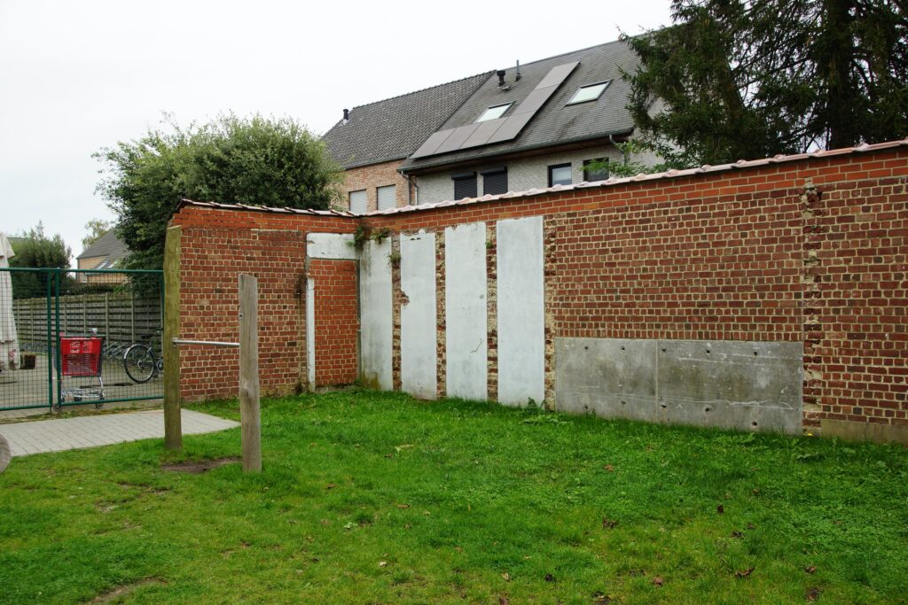 De geschilderde goal herinnert nog aan de schooltijd evenals de oude bel. Vanzelfspreken was de speelplaats, die bijna het hele terrijn innam geplavijd met betontegels. In de hoek is nog de beplijstering te zijn van de originele toiletten. Het laatste hokje bleef echter op slot omdat dit een deur bevatte naar het terrein achter de school.