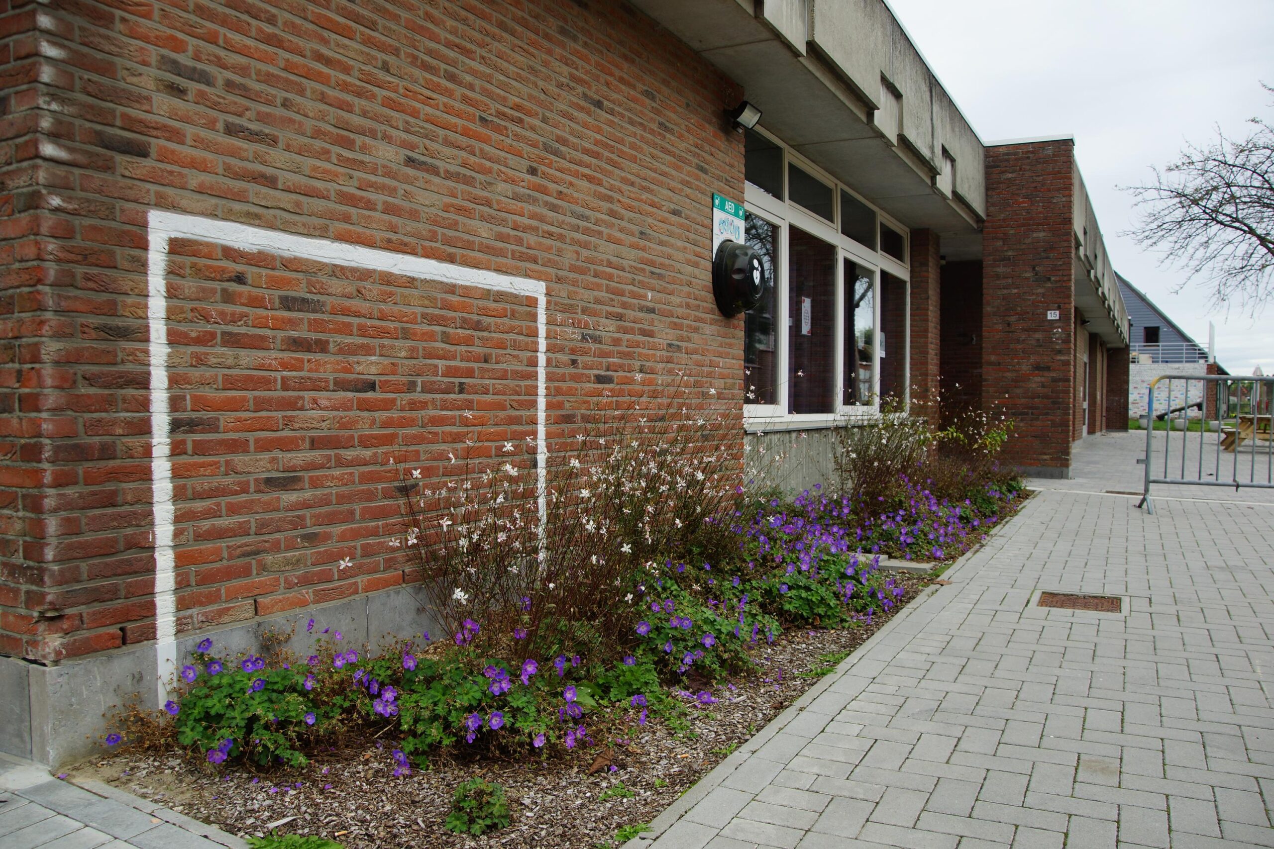 De geschilderde goal herinnert nog aan de schooltijd evenals de oude bel. Vanzelfspreken was de speelplaats, die bijna het hele terrijn innam geplavijd met betontegels. In de hoek is nog de beplijstering te zijn van de originele toiletten. Het laatste hokje bleef echter op slot omdat dit een deur bevatte naar het terrein achter de school.